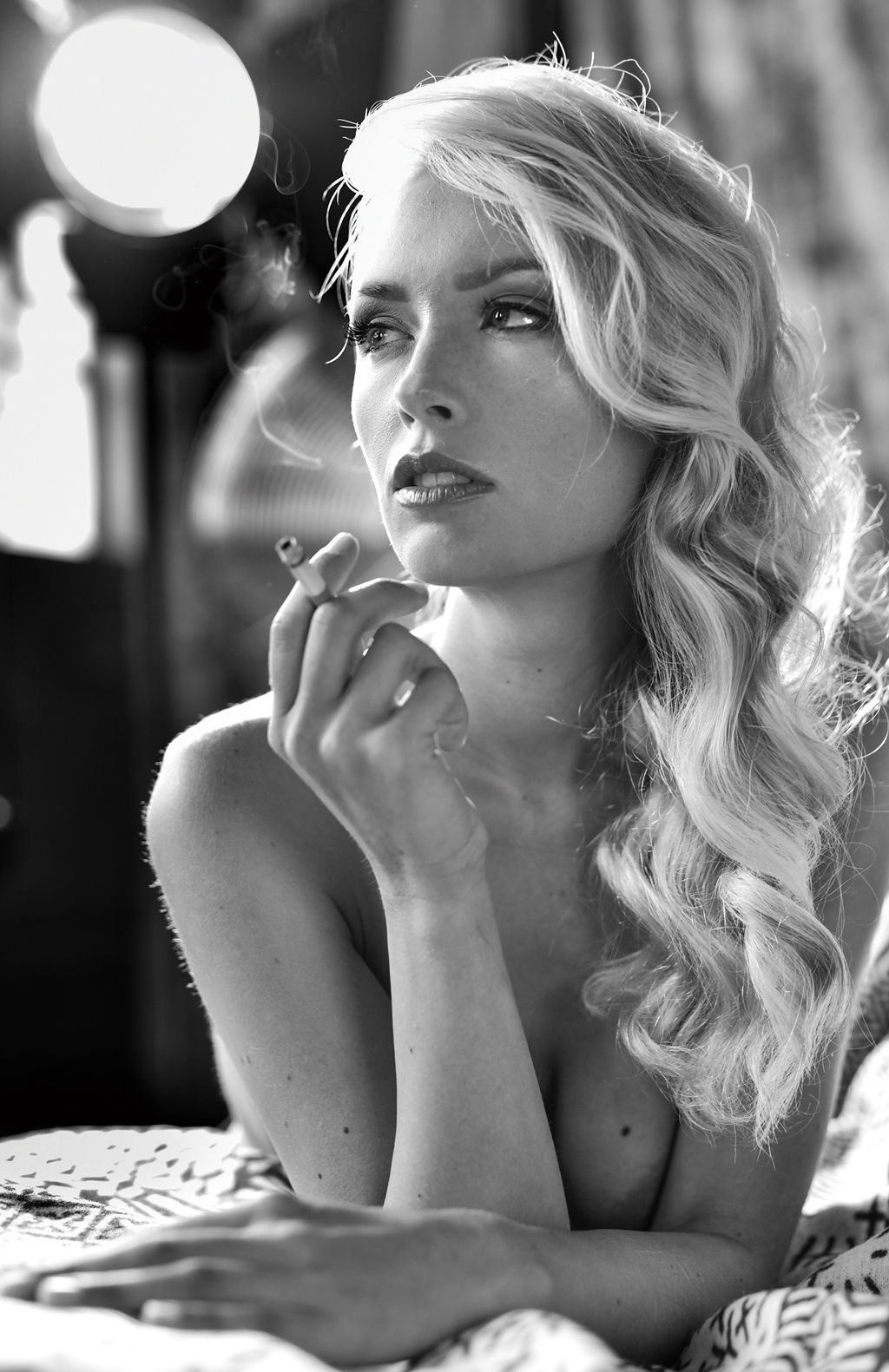 He adds, ‘It’s a combination of ambient light, Rotolights and other lights. I wanted this harsh rim light on her and to see the smoke of her cigarette. As you can imagine with 2000 watts going against your camera it had lots of flare in it. I needed more light from the front so I could work a little bit against this HMI. Even so, I had to use Lightroom to bring a little bit more light to her body. The point is if I have light situations like this I always try to get a compromise. I underlit her body on purpose to enable me to highlight it a bit more in Lightroom, but then I had a good combination of the front and the back information.’